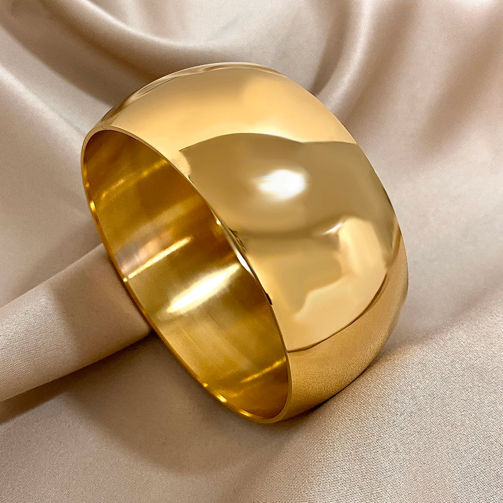 O Bracelete Essencial não é apenas um acessório; é uma peça escultural desenhada para ser o ponto focal do seu visual. Com um design largo, liso e uma curvatura orgânica, ele captura a luz de forma única através do seu acabamento polido de alto brilho, garantindo uma presença magnética e sofisticada.
